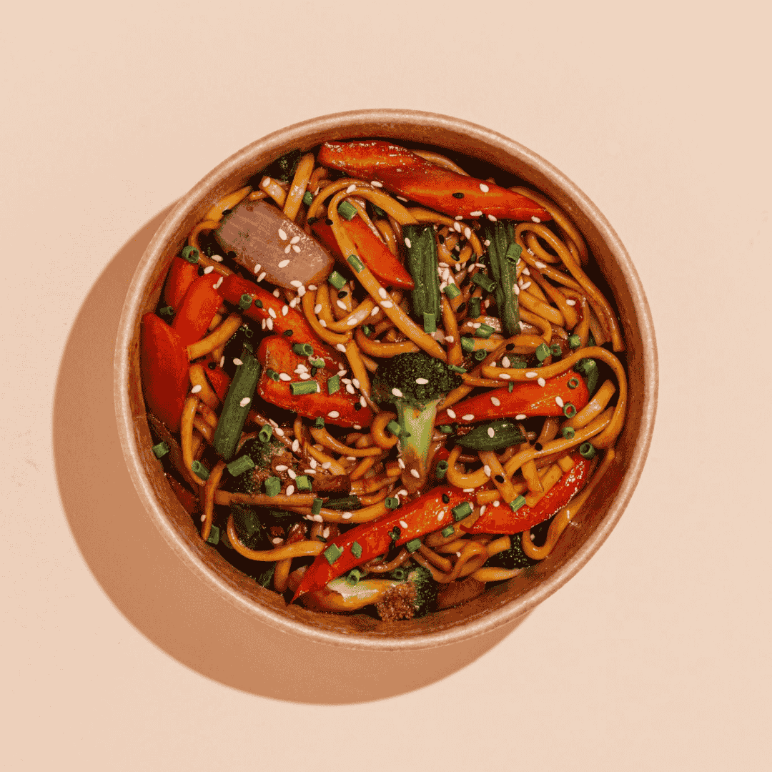 Udon noodles, carrot, bell pepper, broccoli, green beans, red onion, spring onion, chili, ginger, garlic oil, sesame oil, teriyaki sauce, fried onion, sesame seeds